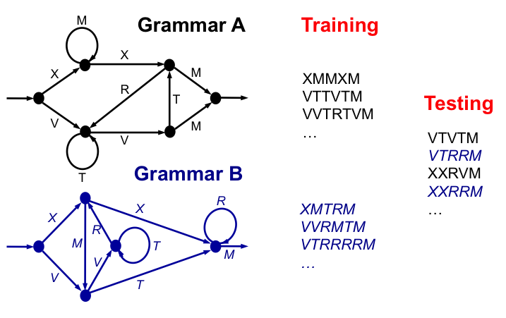 Artificial grammar learning. Two rule sets (shown on the left) determine which letter strings belong to ‘grammar A’ or ‘grammar B’. Participants are first shown examples of strings generated by one or the other grammar (training). Importantly, they are not told about the grammatical rules, and in most cases they remain unaware of them. Nonetheless, after some training they are able to successfully (i.e., above chance) classify novel letter strings appropriately (testing).