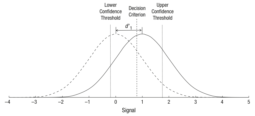 This way of looking at things is formalized by signal detection theory (SDT). The nice thing about SDT is that it can give quantitative mathematical expressions for how well a person can make both first-order and metacognitive judgements, in ways which are not affected by individual biases to say ‘yes’ or ‘no’, or ‘guess’ versus ‘confident’. (The situation is a bit trickier for metacognitive confidence judgements but we can set these details aside for now: see here for the gory details). A simple schematic of SDT is shown below.